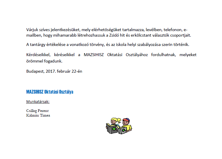 A vonatkozó köznevelési törvény értelmében a teljes általános iskolai rendszerben a 2016/17. tanévtől alternatívaként választható a „Zsidó hit és erkölcstan” című tantárgy.