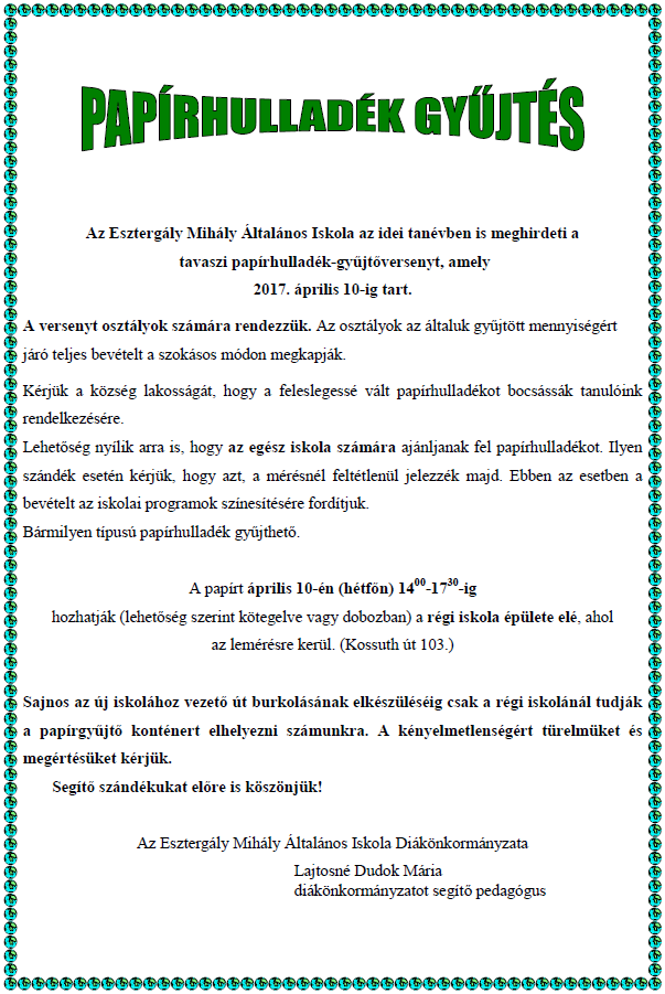 Az Esztergály Mihály Általános Iskola az idei tanévben is meghirdeti a tavaszi papírhulladék-gyűjtőversenyt, amely 2017. április 10-ig tart.